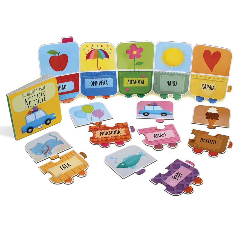 Ανακαλύψτε μέσα σε αυτό το κουτί ένα φανταστικό τρενάκι-παζλ με οικεία αντικείμενα και ζωάκια και ένα βιβλίο με χαρούμενα στιχάκια, που βοηθούν στην εκμάθηση πρώτων λέξεων και εννοιών, καθώς και στην καλλιέργεια της λεπτής κινητικότητας των νηπίων.